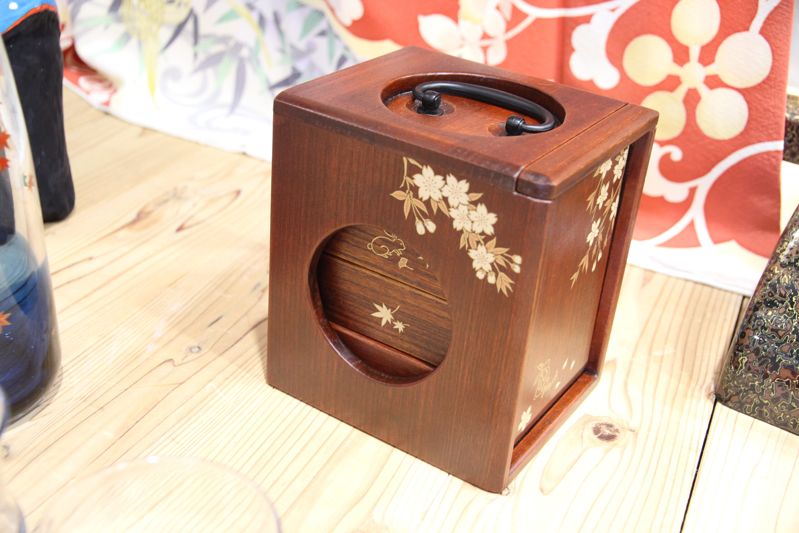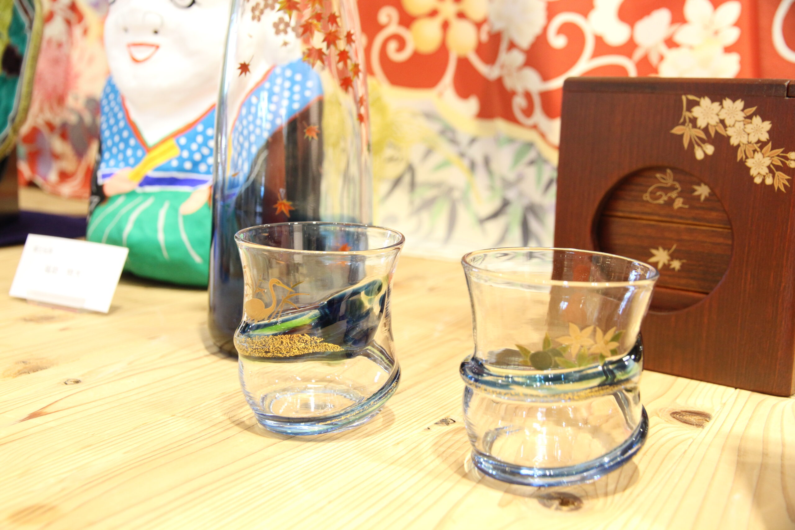 徳島の遊山箱とガラス製品に輪島塗を施し、美しい装飾が目を惹きます。
